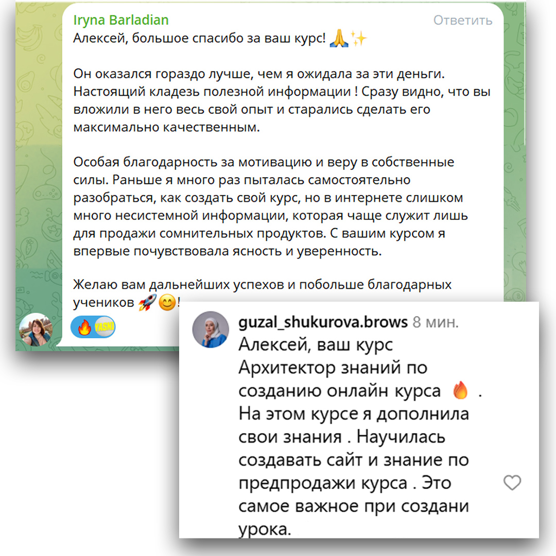 Курс оказался гораздо лучше, чем я ожидала за эти деньги. Раньше я много раз пыталась самостоятельно разобраться, как создать свой курс, но в интернете слишком много несистемной информации, которая чаще служит лишь для продажи сомнительных продуктов. С вашим курсом я впервые почувствовала ясность и уверенность.